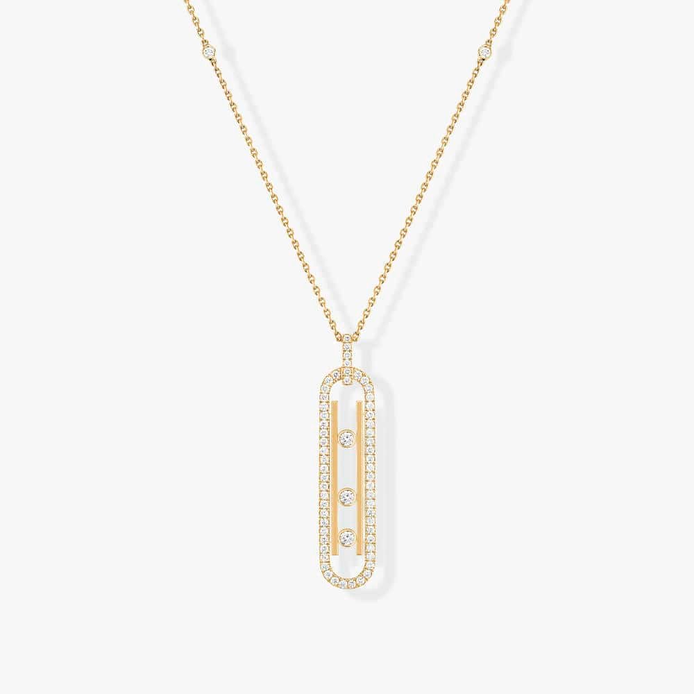 Materials 18-carat Gold, Real Diamonds Length of chain 80cm (adjustable sliding chain) Length of the pattern 40mm Width of the pattern 9mm