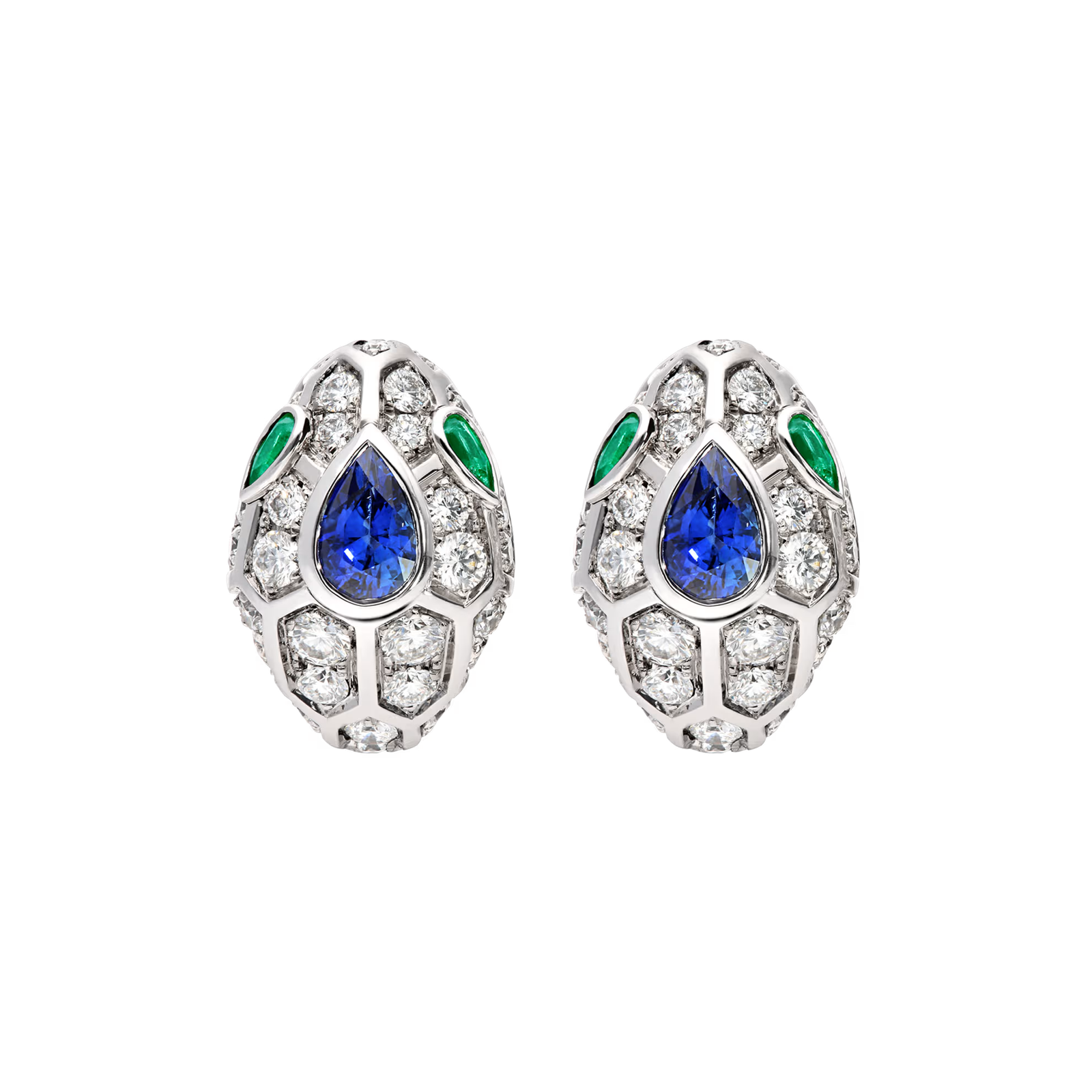 Serpenti 18 carat white gold earrings set with emerald eyes, full pavé diamonds and a blue sapphire on the head